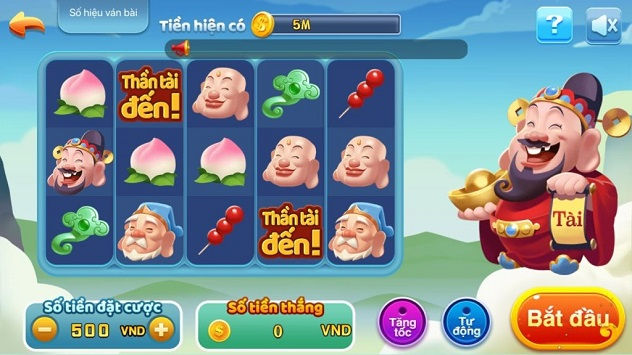 Biểu tượng đặc biệt: Biểu tượng “Thần tài đến”. Biểu tượng này được cho là biểu tượng toàn năng khi nó có thể thay thế hầu hết các biểu tượng. Chỉ trừ biểu tượng duy nhất chiếc chiêng vàng là không thể thay thế được.